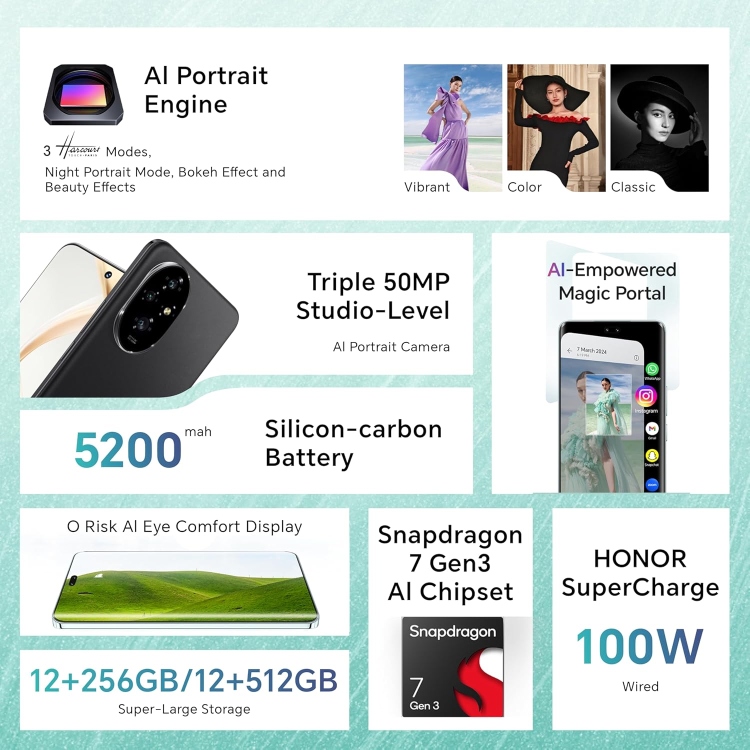 • [5200mAh Silicon-carbon Battery with 100W SuperCharge] Experience worry-free power with a 5200mAh battery, 100W Wired HONOR SuperCharge, ensuring your device is always ready when you are.