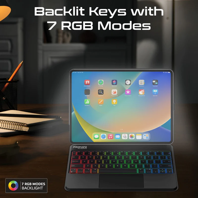 Elevate your iPad experience with the FlexKeys-11Pro, the cutting-edge Folio Touch Wireless Keyboard Case that redefines convenience and style. Boasting a high-precision trackpad and laptop-like typing, this case transforms your tablet into a productivity powerhouse. The stunning RGB backlit keys, featuring 7 different modes, will illuminate your workspace with vibrant colours. Seamlessly connect with the Smart Connector and enjoy efficient 10W passthrough charging for uninterrupted usage. With an adjustable kickstand for versatile viewing angles and comprehensive front and back protection, your iPad stays safe and secure. The Smart Connector ensures seamless connection with the iPad, making the FlexKeys-11Pro the ultimate accessory for your iPad device.