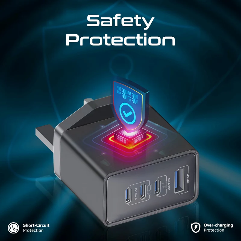 GaNPort4-67PD is the next-generation multi-device wall charger designed to elevate your charging game. Powered by GaNFast™ Gallium Nitride technology, this sleek and powerful charging station delivers a total of 67W through dual USB-C ports, ensuring ultra-fast charging experience for your most demanding devices. Additionally, it features a USB-C port with PD20W and a QC3.0 port with PD22.5W, offering adaptive fast charging for all your gadgets. Safety is paramount with built-in overcharging protection, automatic voltage regulation, and overheating protection, ensuring your devices charge efficiently and securely. Upgrade to the GaNPort4-67PD for unparalleled speed, safety, and versatility.
