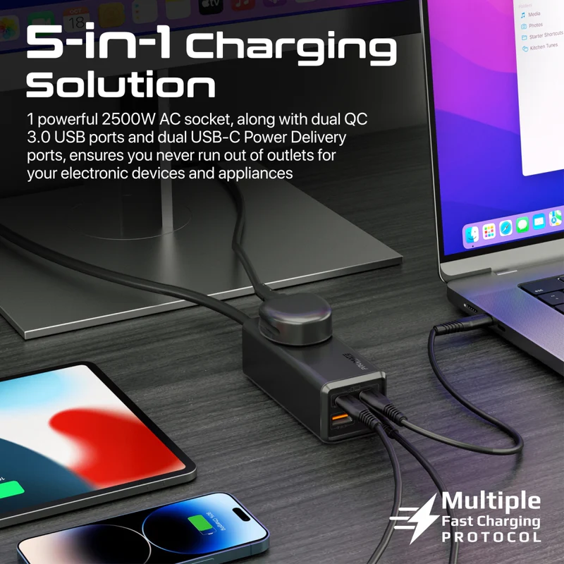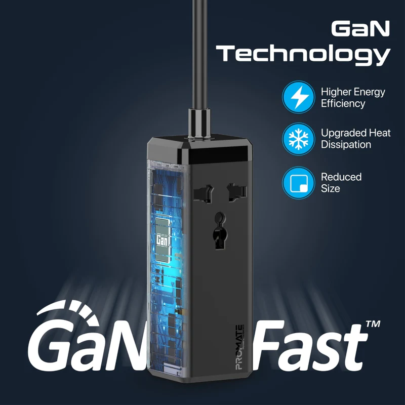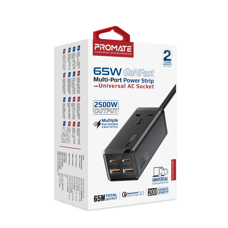 Keep your electronics charged and ready with PowerBrix-GaN65. Featuring Gallium Nitride components this power strip provides an efficient charging experience with less heat and a compact form factor. 1 powerful Universal 2500W AC socket, along with dual 60W QC 3.0 USB ports and dual 65W USB-C Power Delivery ports, ensures you never run out of outlets for your electronic devices and appliances. This power strip also has a built-in multi-protect safety system with high-temperature, over-current, short-circuit protection, and adaptive charging to give you a well-rounded charging experience. Crafted for high-performance charging PowerBrix-GaN65 is a dynamic mix of power and efficiency.