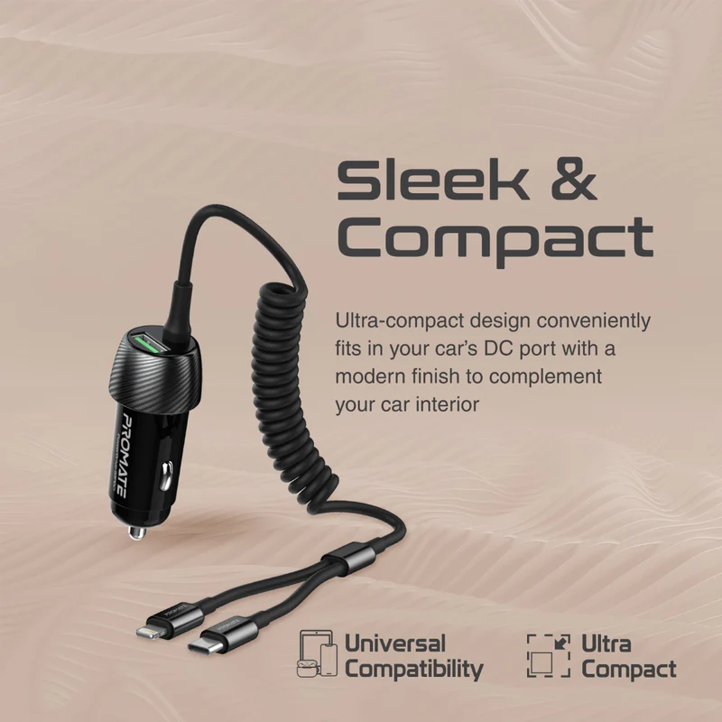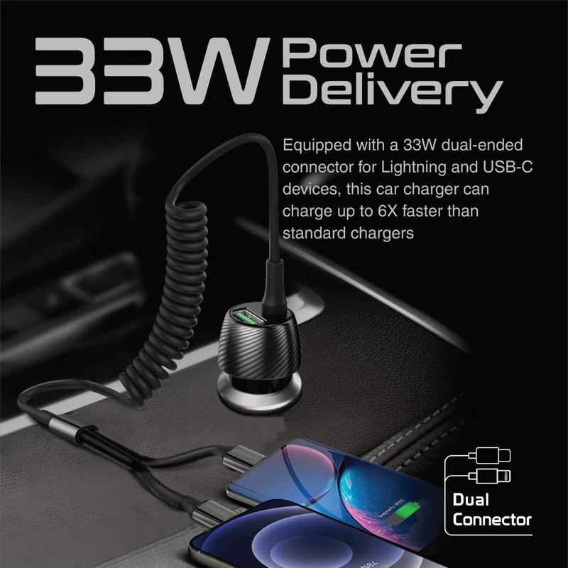 An ultra-compact car charger that is designed to deliver high speed charging to all your connected devices. The built-in Lightning Connector and USB-C coiled cable can stretch from 1 to 3-feet. Its ultra-compact design conveniently fits in your car’s DC port with a modern finish to complement your car interior