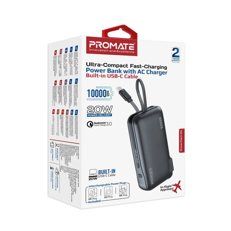 Streamline your on-the-go charging experience with the PowerPack-10C by Promate, the ultimate ultra-compact wall charger and power bank. Boasting a powerful 10000mAh battery capacity and a sleek design, this versatile charging solution features a 20W USB-C in/out port, a 22.5W QC3.0 USB-A output port, built-in 20W USB-C output cable and an integrated USA 2-pin AC plug, plus 2-pin EU and 3-pin UK plug adapters for international AC charging in over 195+ countries. The AC/DC dual mode charging input ensures versatility, while the simultaneous charge and discharge feature keeps your devices powered up without interruption. With automatic voltage regulation and a robust multi-protection system safeguarding against overcharge, over discharge and over-heating you can trust the PowerPack-10C to deliver reliable and efficient charging. Plus, the intuitive digital display keeps you informed of your power status at a glance. Power up with confidence and convenience with Promate’s PowerPack-10C.