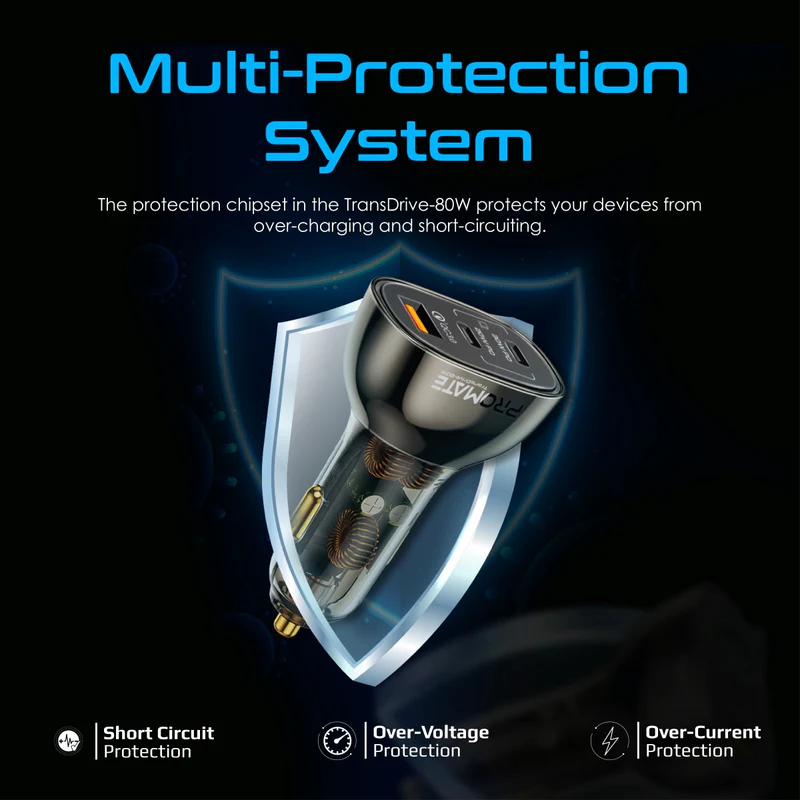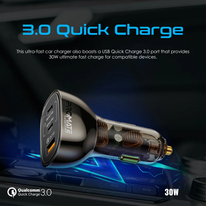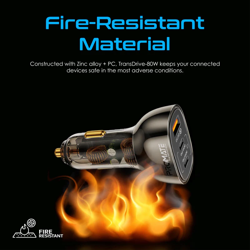 TransDrive-80W is the perfect accessory as this car charger has dual USB-C ports with 30W and 20W Power Delivery along with a 30W Quick Charging 3.0 port, in a unique transparent design. This elegant car charger can rapidly charge your power-hungry devices like laptops, tablets, smartphones, etc. on the go. This mini, rapid car charger is constructed with premium heat dispensation material and IC Technology to provide the fastest possible charge in both ports safely. Stunning finish and super speed charging make TransDrive-80W the ideal charging solution to power your drive.