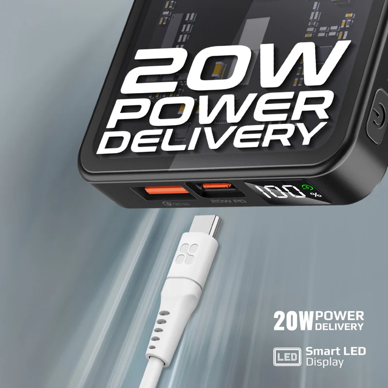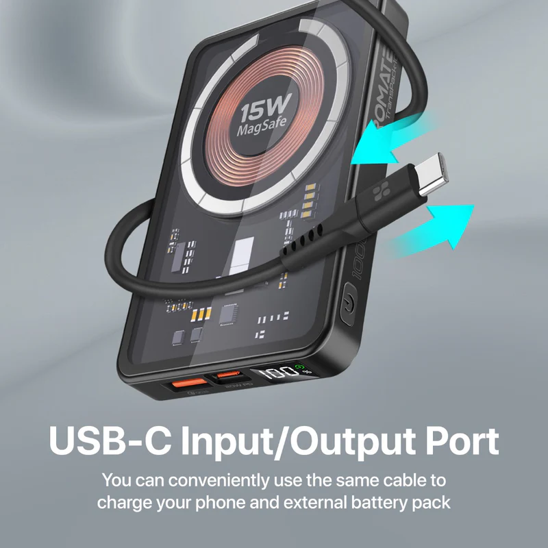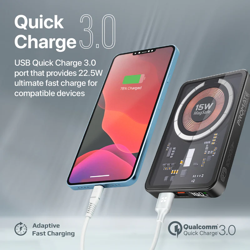 A subtle touch of elegance is added to your charging experience with TransPack-10. The combination of its unique transparent design and MagSafe wireless charging technology makes for a superior, one-of-a-kind charging experience on the go. TransPack-10 features a 15W magnetic charging module that perfectly aligns with the iPhone 14 series for super-fast charging. The 20W Power Delivery port lets you charge your devices up to 4X faster. TransPack-10 also boasts a USB Quick Charge 3.0 port that provides a stunning 22.5W power output. With this stylish and elite power bank, you will be able to charge your devices while on the move.