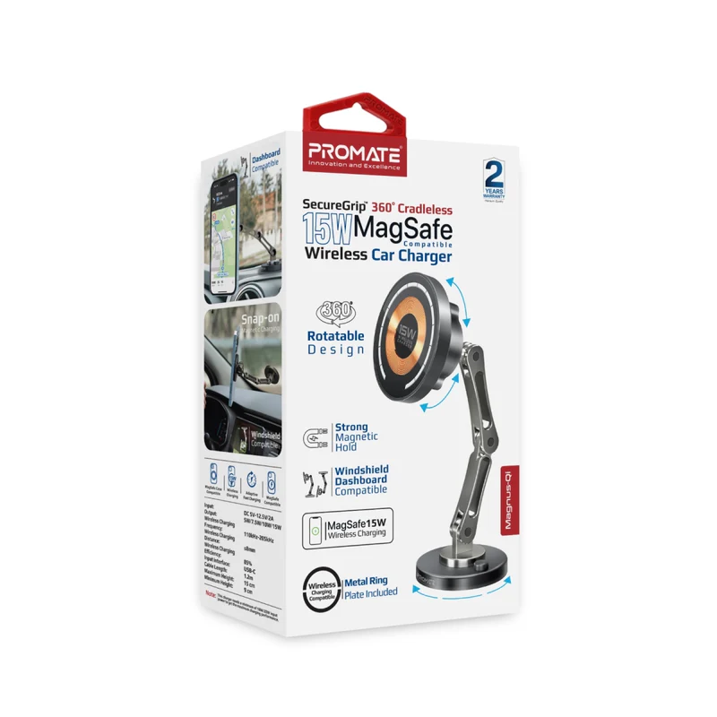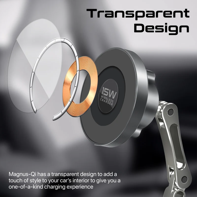 Magnus-Qi is a stunning 15W MagSafe-compatible wireless car mount and the perfect charging solution, designed to enhance your driving experience. The 360° cradleless design coupled with a triaxial height adjustable arm provides infinite viewing angles. This elegant car mount with a unique transparent design, and aluminum rim, makes it the perfect accessory for your car. Magnus-Qi can be mounted directly on your dashboard and is also compatible with the extended dashboard display screens of Tesla, Mercedes, BMW, and other cars without the fear of falling off even in rough driving conditions. Smoothen your journey, and power your smartphone for every adventure with Magnus-Qi.