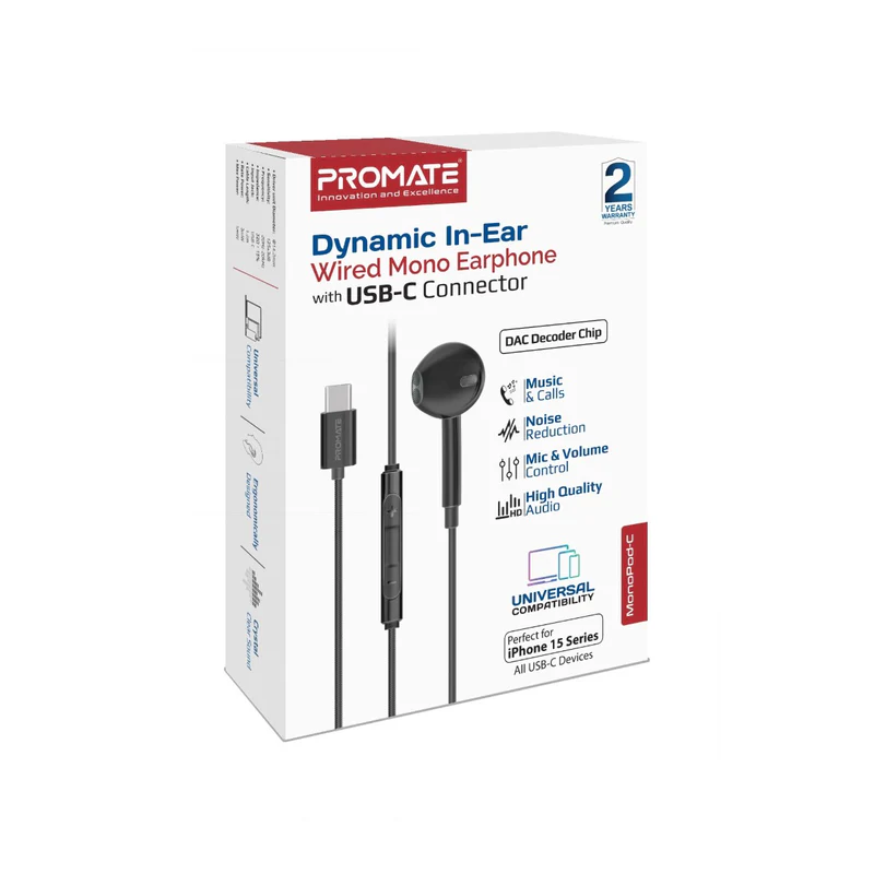 Experience an elevated listening experience with MonoPod-C. These in-ear, mono, USB-C wired earphones are compatible with all USB-C tablet and smartphone devices. Designed for long-lasting listening sessions, the ergonomic mono earbud is comfortable in either ear and the fabric-braided wire ensures high durability. Engage in crystal clear calls with the call button and built-in mic. Control your music playback as well as the volume using the in-line controls. MonoPod-C unlocks your musical getaway with profound bass response and meticulously tuned acoustics.
