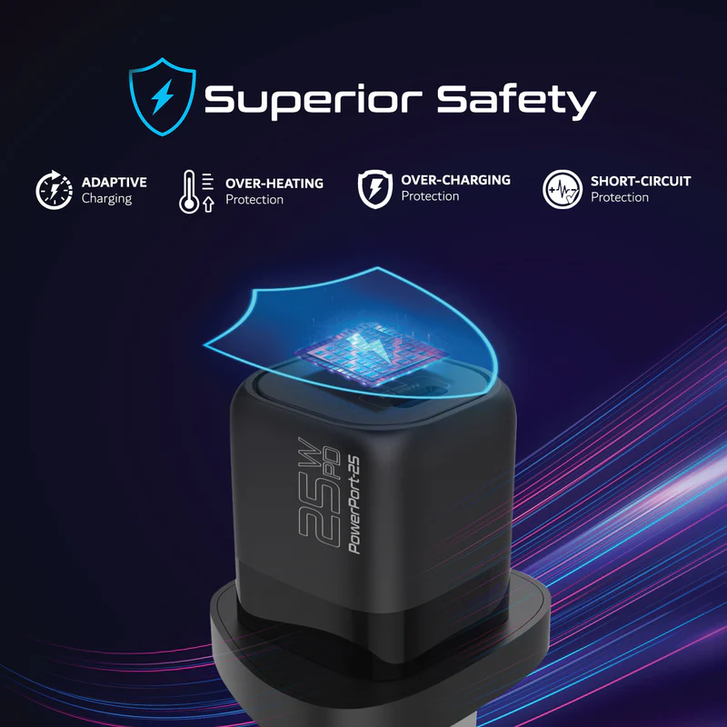 Charge quicker and more efficiently with PowerPort-25. The 25W USB-C Power Delivery ensures your devices are charged up and ready to use up to 5X faster than when using standard chargers. Engineered to provide the safest charge with built-in protection against excessive voltage, current, temperature control, overheating, and overcharging.