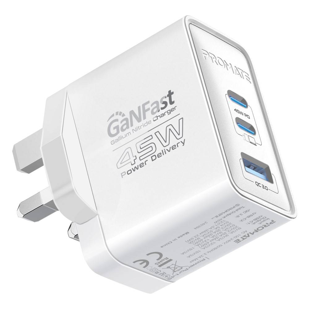 Triple Port Adapter: Maximize your charging capabilities with three versatile ports in one sleek adapter. Perfect for powering multiple devices simultaneously. • GaNFast™ Technology: Experience rapid, efficient charging with advanced GaNFast™ technology. Smaller, cooler, and more powerful than traditional chargers. • Ultra-Fast Dual PD45W USB-C™ Ports: Charge your devices at lightning speed with dual PD45W USB-C™ ports. Ideal for powering laptops, smartphones, and more quickly. • Super-Fast PD22.5W QC 3.0 USB Port: Enjoy swift charging with the PD22.5W QC 3.0 USB port. Perfect for quick power-ups on the go. • UK and EU Plugs Support: Stay connected with PowerPort-45’s support for UK and EU plugs. A great solution for all your travel charging needs. • Multi-Protection System: Protect your devices with built-in safety features. Includes over-current, over-voltage, and short-circuit protection for reliable charging.
