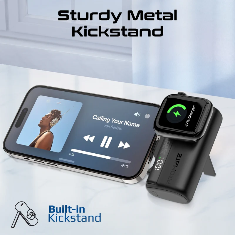 Promate raises the bar for compact portable power with the all-new PowerUp-Trio 5000mAh Mini Power Bank. Seamlessly integrating cutting-edge technology into a compact design, this pocket-sized powerhouse features a trio of charging options including a 20W USB-C™ In/Out foldable connector, 12W Lightning output foldable connector, plus a dedicated 2.5W Apple Watch charger on the front. Engineered for safety and reliability, it includes over-charging and over-heating protection. Its sleek metal kickstand doubles as a sturdy support for hands-free viewing. With a portable, mini form factor, versatile charging options and an intuitive LED display for battery monitoring, the Promate Mini Power Bank is your ultimate companion for staying charged, connected, and in control wherever you go.