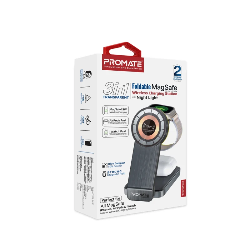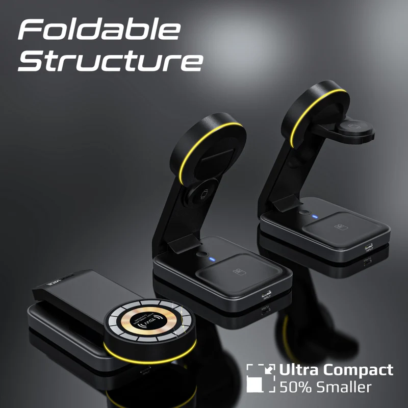 Boasting dedicated charging modules for your smartphone, Apple Watch, and AirPods/AirPods Pro in a stunning transparent and unique foldable design TransFold offers a one-of-a-kind charging experience. This wireless charging station has an LED ring light with 3 modes that let you create the best soothing and relaxing ambiance.